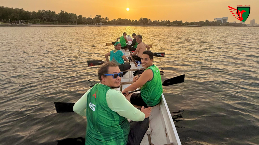Desert Falcons dragon boat practice kicked off on Sunday evening, August 10, 2025, at QD’s – Deira Creek, this time under the warm glow of the late afternoon sun. The breeze was gentle. The water was calm. And the green jerseys were back in action. Perfect time to paddle and grow as a team.