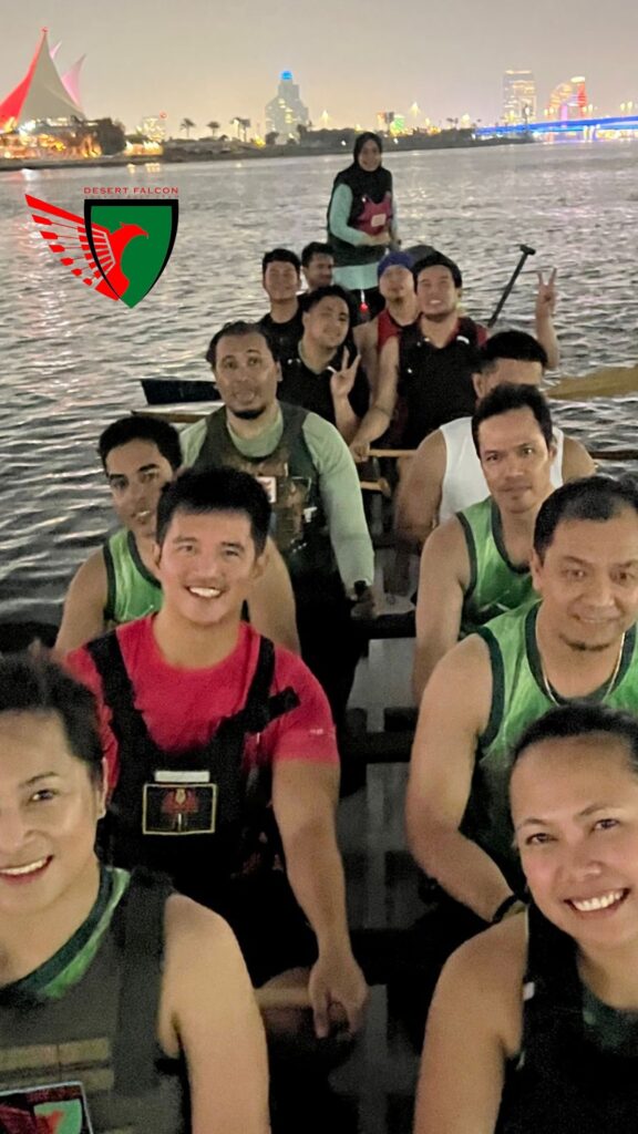 It was another exciting Sunday evening for Dragon Boat Training for Dubai Desert Falcons, and this one felt extra special. On August 24, 2025, the crew came together at QD’s – Deira Creek for our fourth official water training of the season. The call time was set at 7:00 PM, and by 7:30 PM, we were already pushing off the dock in our Falcons Green jerseys, ready to paddle into the night.
