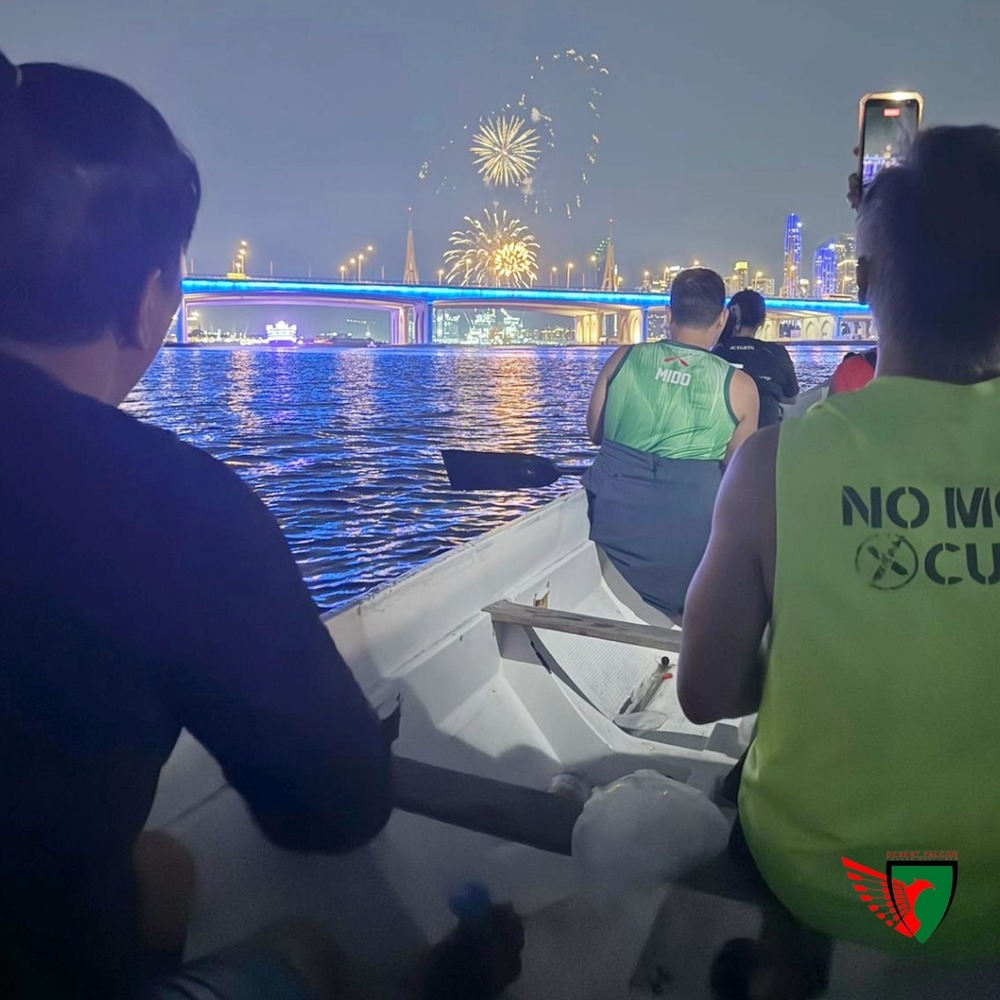 The Dubai dragon boat evening training on Wednesday, January 7, 2026, was conducted at QDβs, Deira Creek, with the team assembling at 7:00 PM, loading the boat by 7:25 PM, and launching the session promptly at 7:30 PM. Dressed in Falcons Green, the crew trained under the guidance of Coach and steerer Intan, maintaining a steady rhythm throughout the paddle. The session included a row upstream toward Dubai Festival City, where the team paused briefly on the water to take in the fireworks lighting up the night sky, adding a memorable highlight to the evening. After completing the row, the celebration continued back on land as Mahmoud treated the team with pizza, marking his birthday in true Desert Falcon spirit.